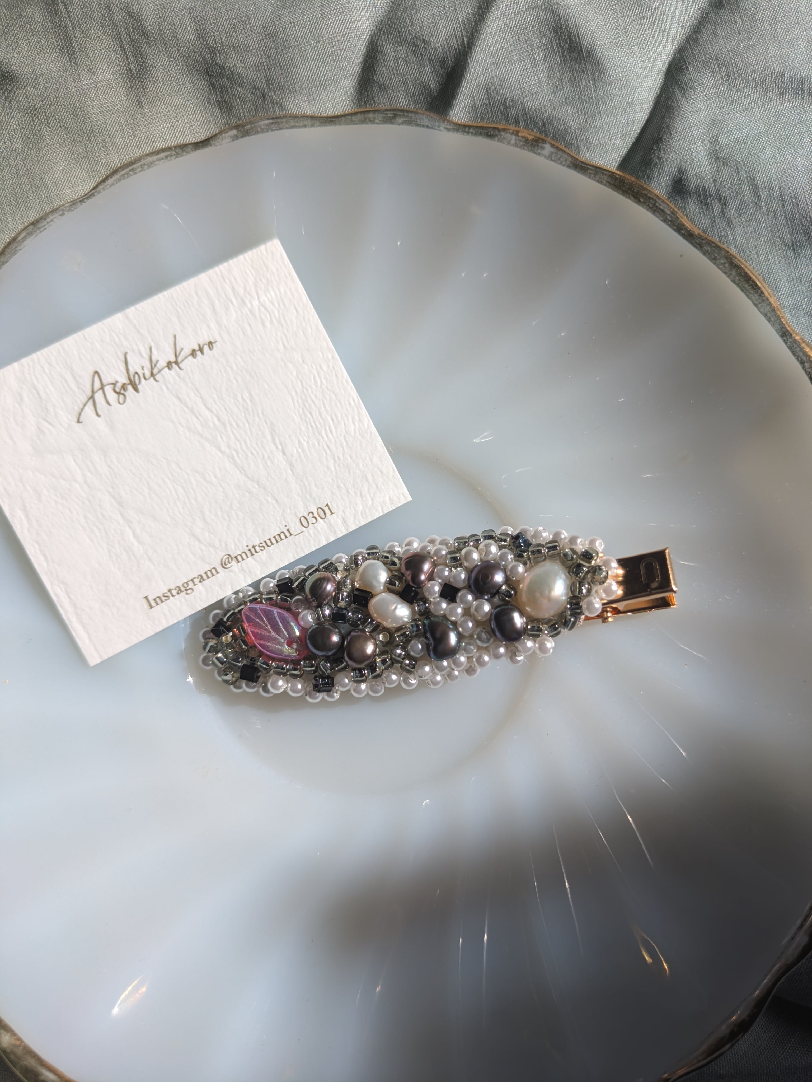 ビーズ刺繍のヘアクリップ◇チェコビーズと淡水パールブラック
